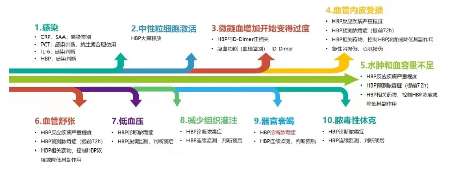 因血管通透性的增加,进而导致的低血压、微循环紊乱、缺氧和器官功能障碍是严重脓毒症的主要特征,也是最终导致患者死亡的主要原因。HBP具备的促炎作用及诱导血管渗漏的能力,使其在脓毒症诊断及预后评估中具有较好的潜力。